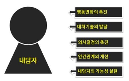 ù°, ³»´ãÀÚ¸¦ µ½´Â »ó´ãÀÚÀÇ °¡Àå Å« Ư¡Àº »ó´ãÀÚ Àڽſ¡ ´ëÇÑ ÀÌÇØ¿Í ¼ö¿ëÀÌ´Ù. »ó´ãÀÚ´Â ÀÚ½ÅÀÌ ¾î¶² »ç¶÷ÀÎÁö¸¦ Àß ¾Ë°í ÀÖ¾î¾ß ÇÑ´Ù. Áï, ÀÚ½ÅÀÌ ¾î¶² ÀλýÀ» »ì¾Æ¿ÔÀ¸¸ç, ±×°ÍÀÌ ÇöÀç¿¡ ¾î¶² ¿µÇâÀ» ¹ÌÃÆ°í ¹Ì·¡¿¡´Â ¾î¶² ¸ð½ÀÀ¸·Î »ì¾Æ°¥ °ÍÀÎÁö¸¦ ¾Ë°í ÀÖ¾î¾ß ÇÑ´Ù. »ó´ãÀÚ´Â ÀÚ½ÅÀ» ÀνÄÇϰí ÀÌÇØÇϸç ÀÚ½ÅÀÇ ¸ð½ÀÀ» ÀÖ´Â ±×´ë·Î ¼ö¿ëÇÒ ¼ö ÀÖ¾î¾ß ÇÑ´Ù. ÀÚ½ÅÀÇ ¿å±¸, ´Ù¸¥ »ç¶÷À» µµ¿ÍÁÖ°íÀÚ ÇÏ´Â µ¿±â, ÀÚ½ÅÀÇ °¨Á¤À̳ª Á¤¼, ÀÚ½ÅÀÇ ÀåÁ¡°ú ´ÜÁ¡, ±×¸®°í ¹®Á¦ÇØ°á ±â¼ú µî¿¡ ´ëÇÑ ÀνÄÀÌ ÀÖ¾î¾ß ÇÑ´Ù. ÀÌ·¯ÇÑ Åõ»ç´Â »ó´ã°úÁ¤¿¡¼ ³»´ãÀÚ ¹®Á¦¸¦ À߸ø ÀÌÇØÇÔÀ¸·Î½á È¿°úÀûÀÎ »ó´ã°úÁ¤À» ¹æÇØÇÏ´Â ¿ä¼Ò·Î ÀÛ¿ëÇÑ´Ù.