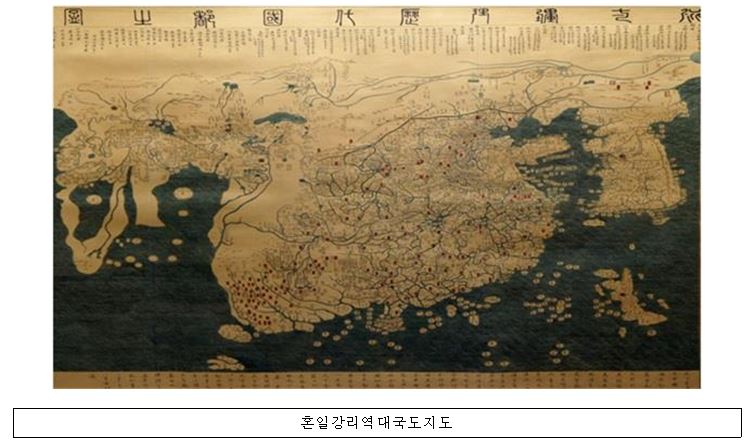 ¹°·Ð ¼¼°èÀÇ °³³äÀº ½Ã°£ÀÌ È帣°í, °úÇбâ¼úÀÌ ¹ßÀüÇÔ¿¡ µû¶ó º¯ÈÇÑ´Ù. ¿À´Ã³¯ ÇöÁ¸ÇÏ´Â ¼¼°èÁöµµ °¡¿îµ¥ °¡Àå ¿À·¡µÈ °ÍÀº ³î¶ø°Ôµµ ¿ì¸®³ª¶ó¿¡¼ ¸¸µé¾îÁø ¡®È¥Àϰ¸®¿ª´ë±¹µµÁöµµ¡¯ÀÌ´Ù. ÀÌ ¼¼°èÁöµµ´Â ÅÂÁ¾ 3³âÀÎ 1402³â¿¡ Á¦ÀÛµÈ °ÍÀ¸·Î¼ ÇöÀç ¿øº»Àº Á¸ÀçÇÏÁö ¾ÊÁö¸¸, °¡Àå ¿À·¡µÈ »çº»ÀÌ ÀϺ» ·ùÄÚÄí ´ëÇÐ µµ¼°ü¿¡ Àü½ÃµÇ¾î ÀÖ´Ù. ¡®È¥Àϰ¸®¿ª´ë±¹µµÁöµµ¡¯, ÀÏ¸í ¡®°¸®µµ¡¯´Â °¢ ³ª¶óÀÇ ¼öµµ¿Í Áß¿äÇÑ µµ½Ã¸¦ Ç¥±âÇÑ ¼¼°èÁöµµ·Î¼ ¸ù°ñÁ¦±¹ÀÇ Áöµµ Á¦ÀÛ±â¹ýÀ» ¼ö¿ëÇØ¼ ¸¸µç ¼¼°èÁöµµÀÌ´Ù. ÀϹÝÀûÀ¸·Î Áß±¹¿¡¼ Á¦ÀÛµÈ ¼¼°èÁöµµ´Â ¿ì¸®³ª¶ó³ª ÀϺ»À» ÀÚ¼¼È÷ ±×¸®Áö ¾Ê´Âµ¥, ¡®°¸®µµ¡¯´Â Áß±¹¿¡¼ Á¦ÀÛµÈ Áöµµ¿¡ ¿ì¸®³ª¶ó ¹× ÀϺ»À» º¸¿ÏÇØ¼ ±×¸° °ÍÀ¸·Î º¼ ¼ö ÀÖ´Ù. ¹ß¹®¿¡ µû¸£¸é, ÁÂÁ¤½Â ±è»çÇü°ú ¿ìÁ¤½Â À̹«, ÀÌȸ°¡ Á¦ÀÛÇß´Ù.