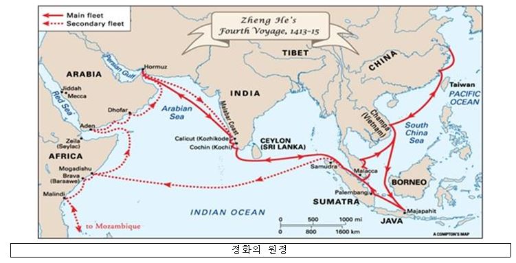 Áß±¹¿¡¼´Â ¸¶Á©¶õÀÇ ¼¼°è ÀÏÁÖº¸´Ù ¸ÕÀú ¾ÆÇÁ·Î-À¯¶ó½Ã¾ÆÀÇ ¿©·¯ Áö¿ªÀ» Ç×ÇØÇß´ø ¼¼°èÀÏÁÖ°¡ ³ªÅ¸³µ´Ù. 1405³â~1433³â±îÁö ÃÑ 7Â÷·Ê¿¡ °ÉÃÄ ÀÌ·ç¾îÁø ÀÌ Ç×ÇØ¸¦ ¸¹Àº ¿ª»çÇÐÀÚµéÀº ¡®Á¤ÈÀÇ ¿øÁ¤¡¯À̶ó°í ºÎ¸¥´Ù. Á¤ÈÀÇ ¿øÁ¤Àº ¸í³ª¶ó 3´ë ȲÁ¦ÀÎ ¿µ¶ôÁ¦ÀÇ ¸íÀ¸·Î ½ÃÀÛµÈ °ÍÀ¸·Î¼ ¿ª»çÇÐÀÚµéÀº Á÷Á¢ÀûÀÎ µ¿±â¸¦ Á¤Ä¡ÀûÀÎ °ÍÀ¸·Î ÃßÁ¤Çϰí ÀÖ´Ù. ¿µ¶ôÁ¦´Â ¿ì¸®³ª¶ó ¼¼Á¶¿Í ¸¶Âù°¡Áö·Î Á¶Ä«¸¦ ³»ÂѰí ȲÁ¦·Î ÁïÀ§Çß´Ù. ¼÷ºÎ¸¦ ÇÇÇØ °³²À¸·Î µµ¸Á°£ Á¶Ä«¸¦ ã±â À§ÇØ ¿øÁ¤´ë¸¦ º¸³½ °ÍÀÌ ¹Ù·Î Á¤ÈÀÇ ¿øÁ¤À̶ó°í º¸´Â °ÍÀÌ´Ù. ÀÌÈÄ Á¤ÈÀÇ ¿øÁ¤Àº Áß±¹Çظ¦ °ÅÃÄ µ¿³²¾Æ½Ã¾Æ¿Í Àεµ, ¾Æ¶óºñ¾Æ ¹Ýµµ, ±×¸®°í ¾ÆÇÁ¸®Ä« ºÏºÎ Áö¿ª±îÁö ¾ÆÇÁ·Î-À¯¶ó½Ã¾ÆÀÇ ¿©·¯ Áö¿ªÀ» Ç×ÇØÇÏ¸é¼ ´ç½Ã ¸í³ª¶óÀÇ Á¤Ä¡Àû À§»ó°ú °æÁ¦Àû ºÎ¸¦ °ú½ÃÇß´Ù.